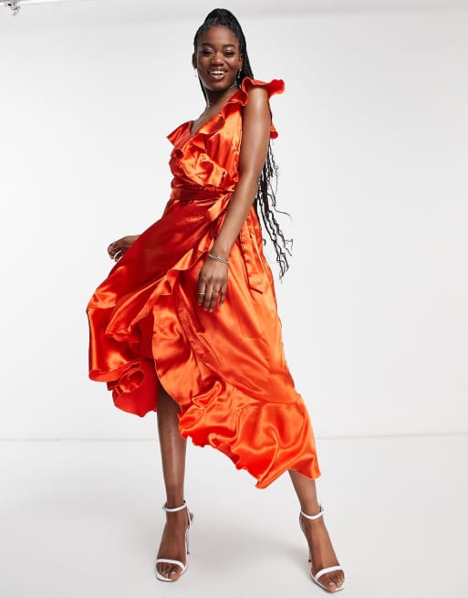 Little Mistress Bridesmaid ruffle wrap dress in sunset orange Very well made.
