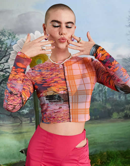 COLLUSION spliced mesh long sleeve crop top in orange Very well made.