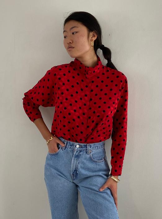 Vintage Red Black Polka Dot Blouse Top Shirt for Women Long Very well made.