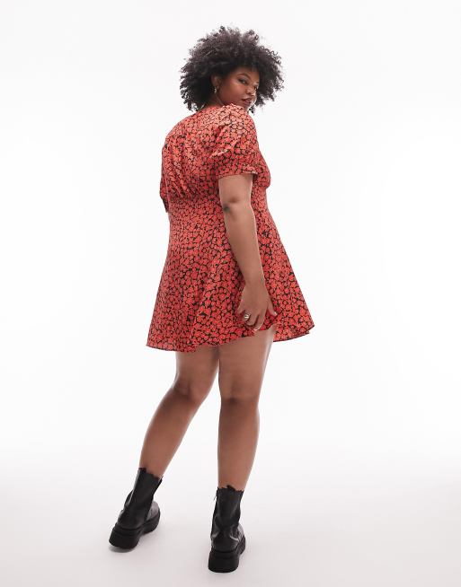 Topshop Curve Bella V neck mini tea dress in red floral print Very well made.