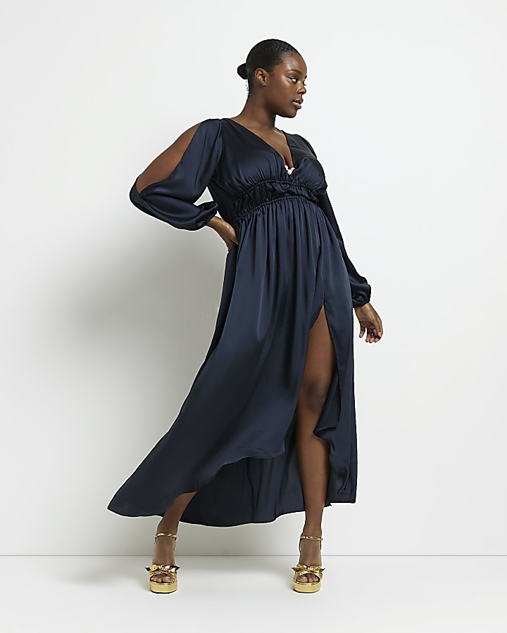 Plus navy satin cold shoulder maxi dress River Island Very well made.