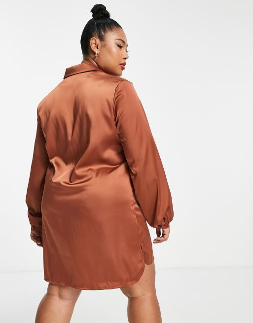 Flounce London Plus mini satin shirt dress in chocolate brown Very well made.