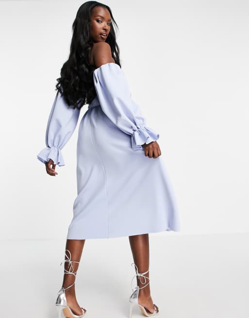 ASOS DESIGN shirred bardot blouson sleeve prom midi dress in baby blue Very well made.