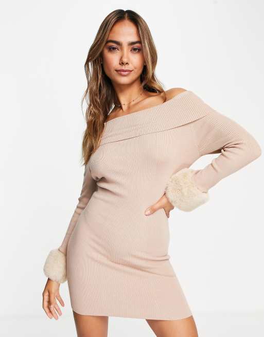 Miss Selfridge fold over knit rib bardot mini dress with faux fur Very well made.