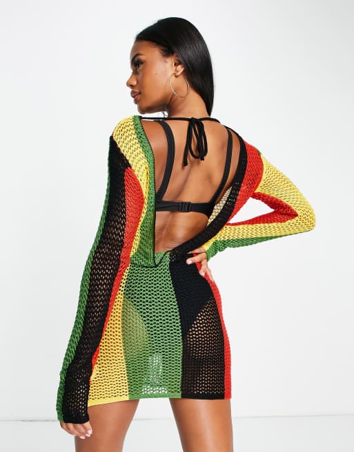 I Saw It First striped backless knitted mini festival dress in red yellow green and black Very well made.