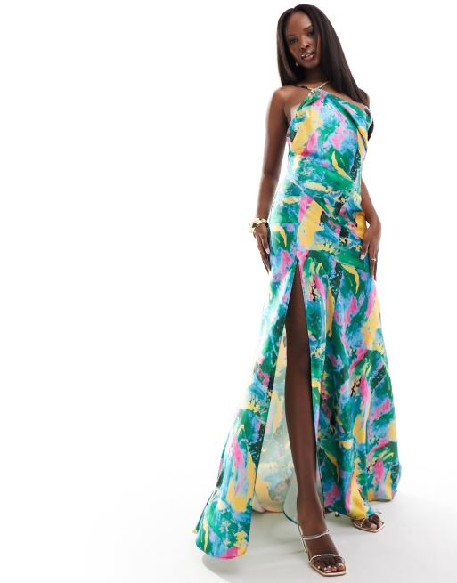 True Violet satin one shoulder slip maxi dress in abstract print Very well made.