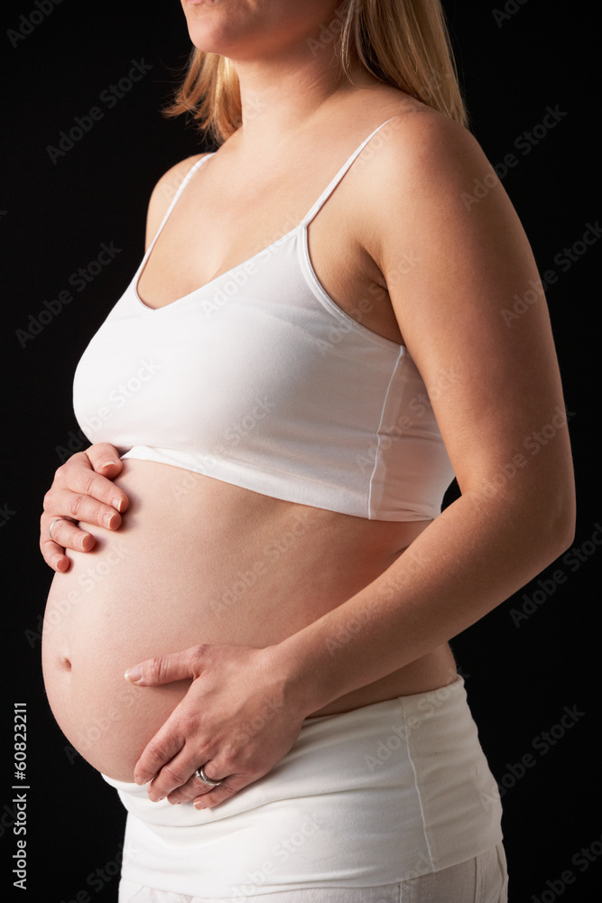 Portrait of 5 Months Pregnant Woman Wearing White on Black Very well made.