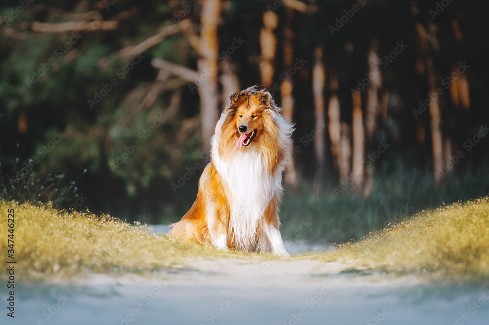 Fluffy ginger collie dog. Large puppy with long hair Stock Photo Very well made.