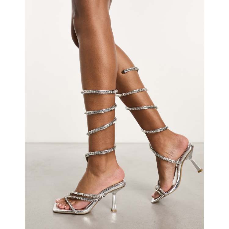 ASOS DESIGN Non stop embellished ankle coil high heeled sandals in silver Very well made.