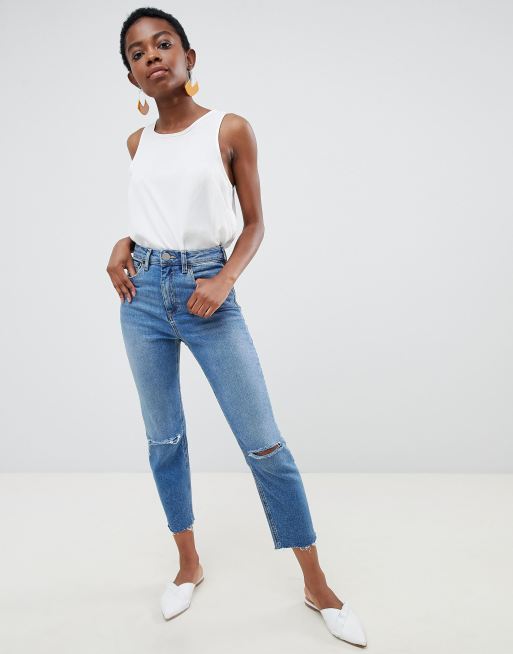 ASOS DESIGN Petite Farleigh high waisted slim mom jeans in mid stonewash blue with rips Very well made.