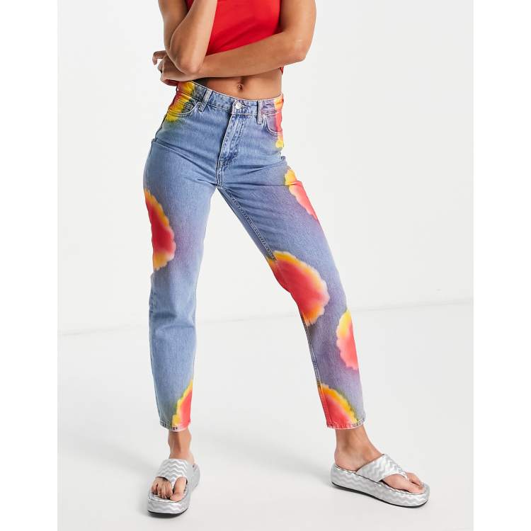 Only high waisted straight leg jeans in light blue with tie dye spots Very well made.