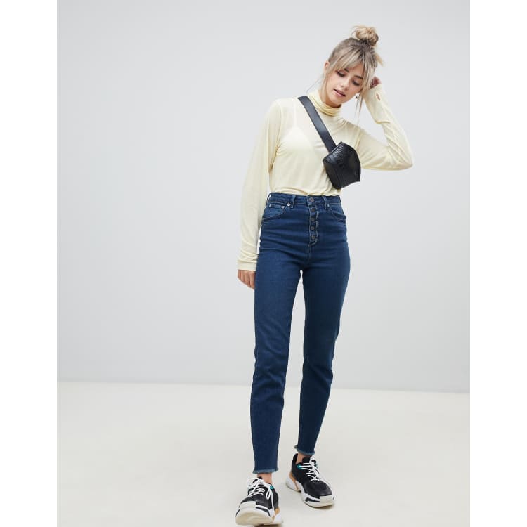 ASOS DESIGN high rise farleigh slim mom jeans in dark london blue wash with exposed button fly Very well made.