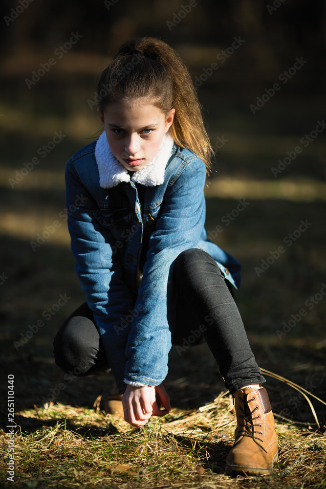 Eleven year old girl in a denim jacket posing for the camera in a Very well made.