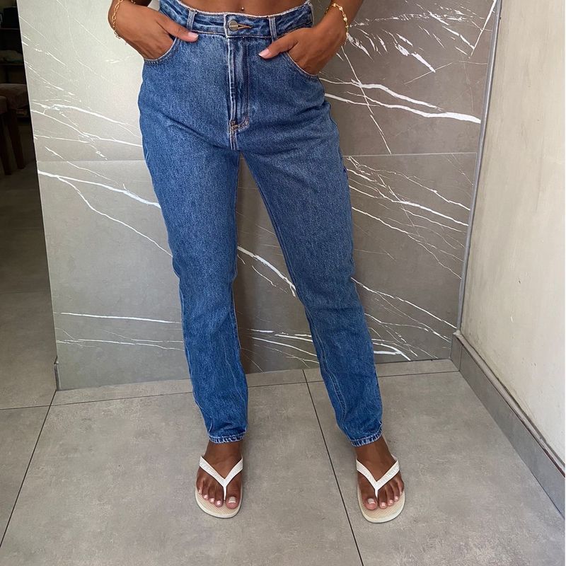 Cal a Mom B sico Jeans com Cintura Alta e Barra Dobrada Azul Very well made.