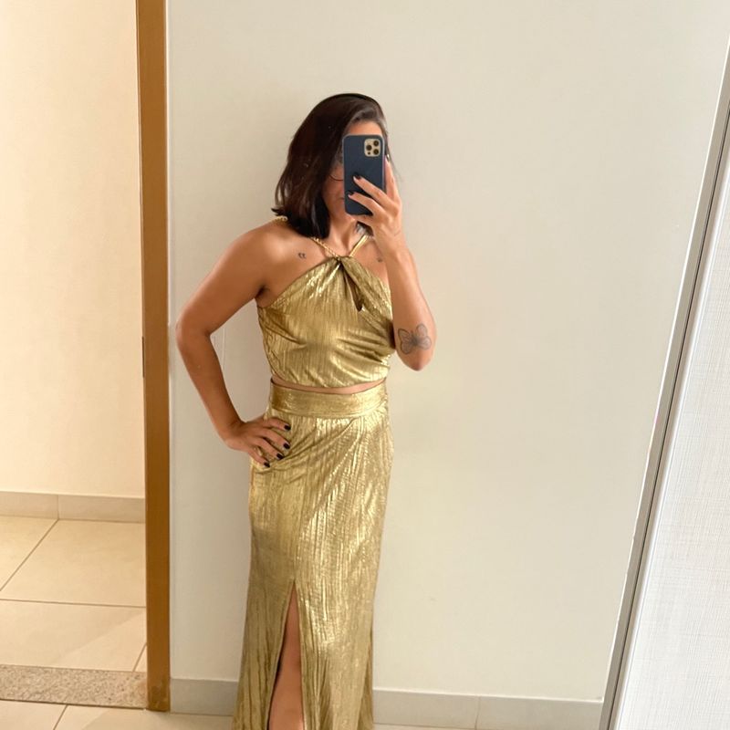 cropped branco babados saia plissada dourada Saia plissada Very well made.