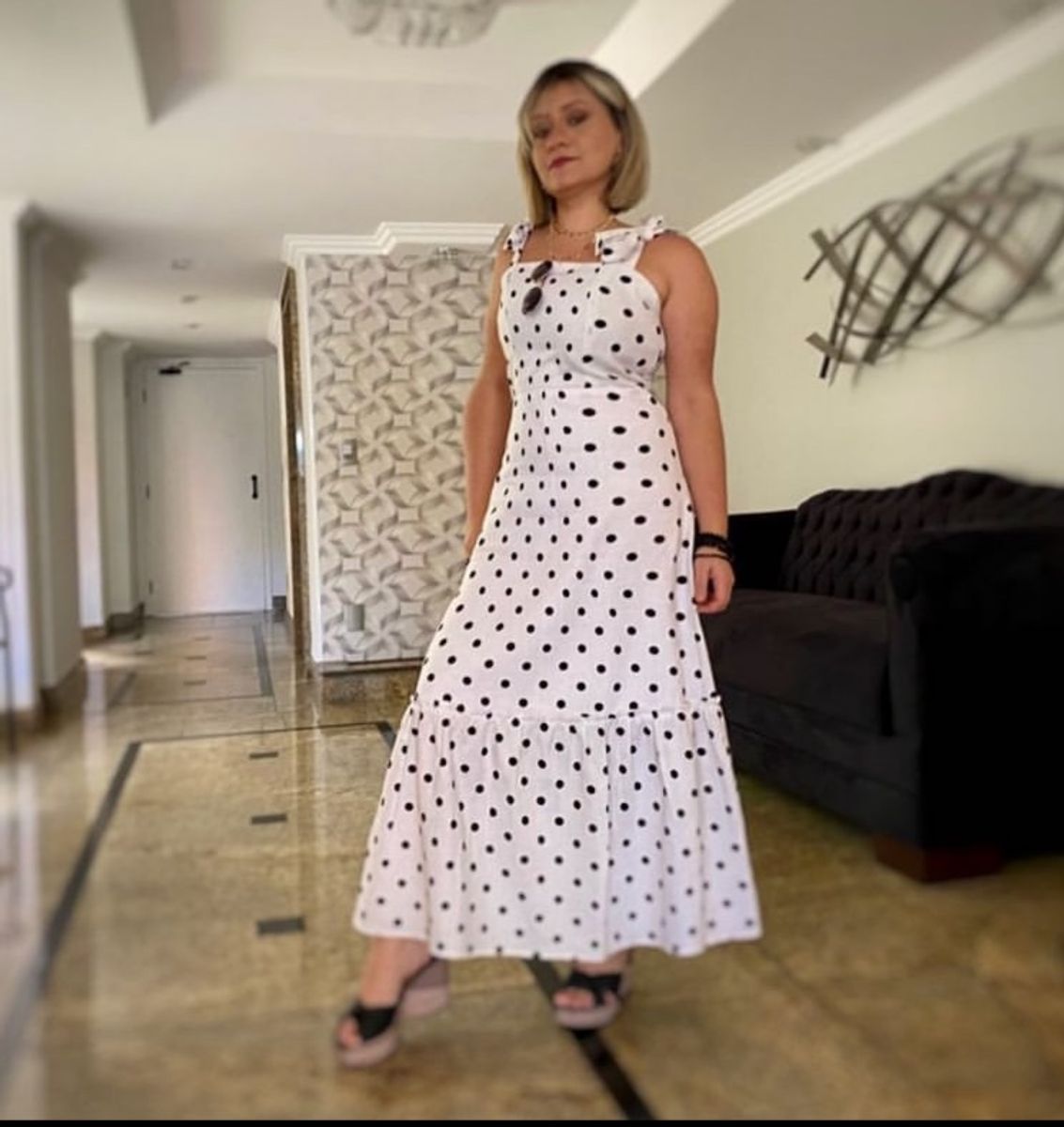 Vestido Estampado de Bolinhas Rodado Sob Branco e Preto Compre Very well made.