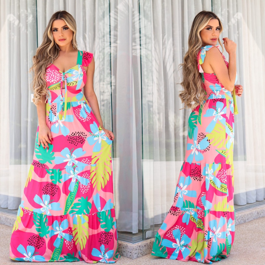 Vestido Longo Estampado Al a Babado e Lastex Floral ou Animal Print Ver o 2023 Very well made.