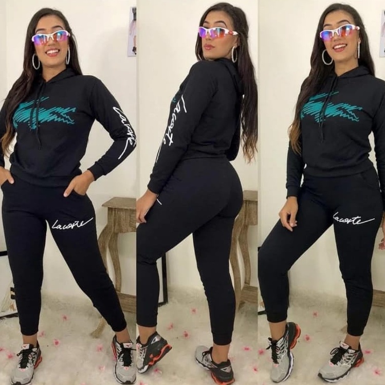 Conjunto Moletom Feminino Lacoste Blusa com Capuz Cal a Cintura Alta Moda Feminina Fio Inverno Very well made.