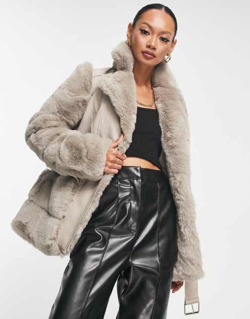 River Island belted faux fur biker jacket in light gray Very well made.