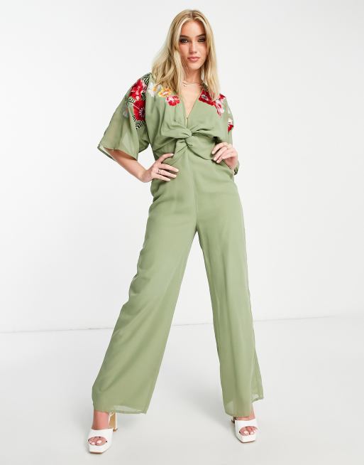 Hope Ivy embroidered plunge wide leg jumpsuit in olive green Very well made.