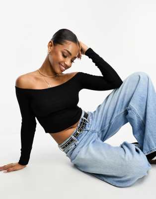 Pull Bear Ribbed Long Sleeved Bardot Top In Black ModeSens Very well made.