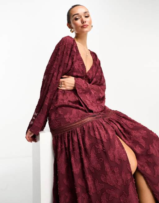 ASOS DESIGN burnout v neck batwing midi dress with button through detail in burgundy Very well made.