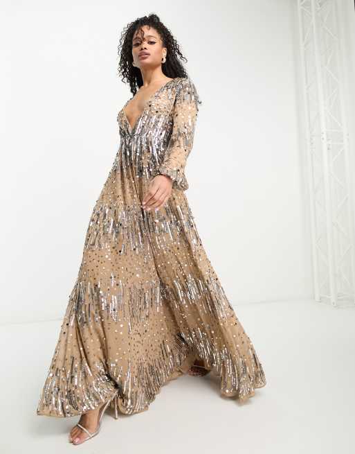 ASOS DESIGN embellished scatter sequin plunge maxi dress with balloon sleeve in taupe Very well made.
