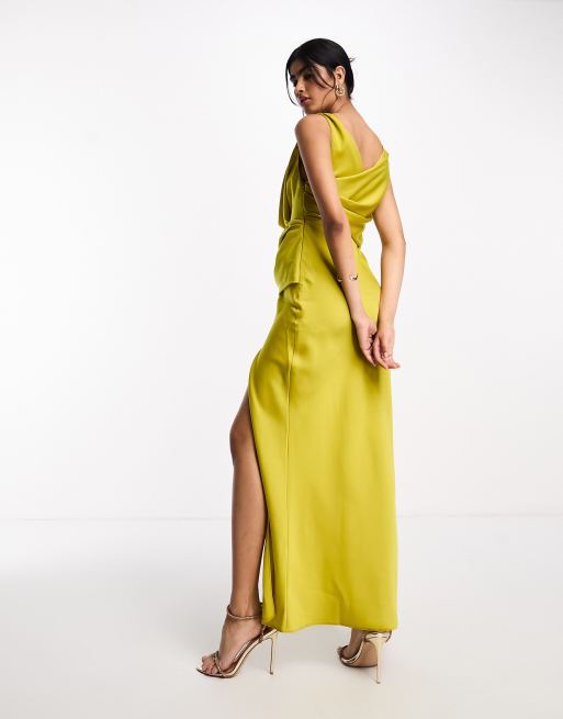 ASOS DESIGN satin cowl neck maxi dress with ruching detail in gold Very well made.