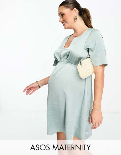 ASOS DESIGN Maternity satin angel sleeve mini tea dress in duck egg Very well made.