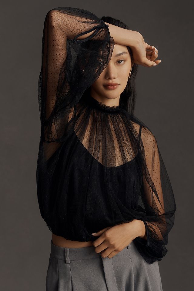 Maeve Sheer High Neck Ruched Long Sleeve Blouse Very well made.