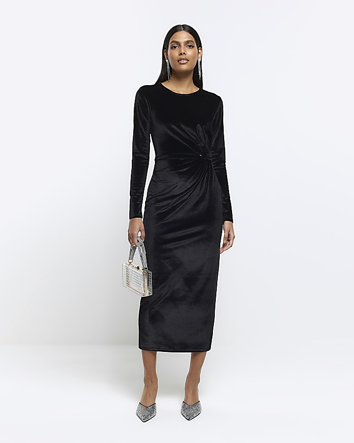 Black velvet twist bodycon midi dress River Island Very well made.
