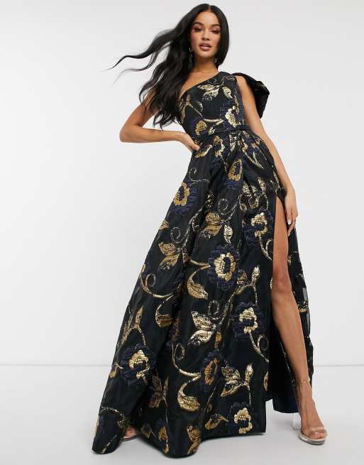 Bariano one shoulder prom dress with thigh split in navy jacquard print Very well made.