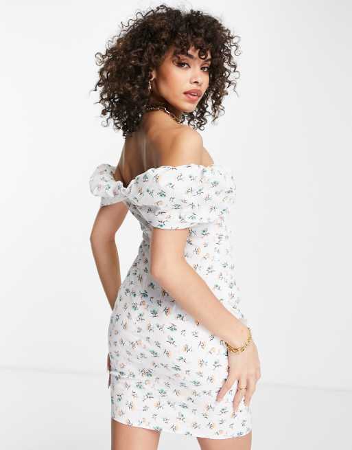 Missguided bardot puff tie front floral mini dress in white Very well made.