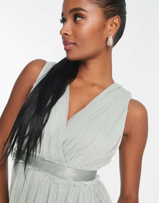 Anaya Petite Bridesmaid v neck ruffle waist maxi dress in sage green Very well made.
