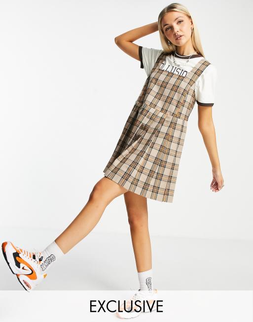 COLLUSION pleated mini pinafore dress in brown and orange check Very well made.