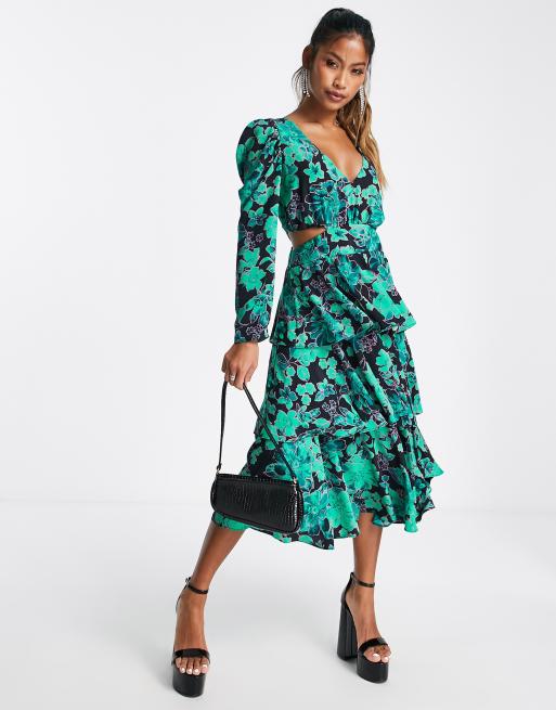 Topshop cut out side tiered floral midi dress in green Very well made.