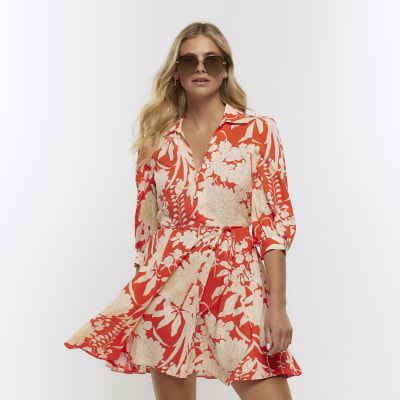 Red linen blend floral mini shirt dress Very well made.