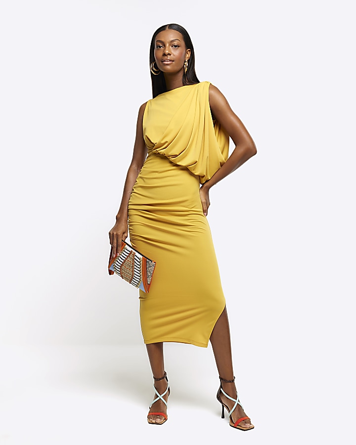 River Island Yellow Satin Animal Print Slip Midi Dress in Metallic Very well made.