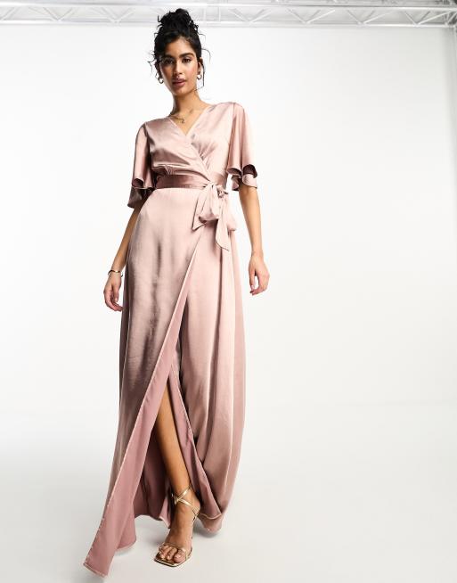 Six Stories Bridesmaids angel sleeve wrap satin maxi dress in rose Very well made.