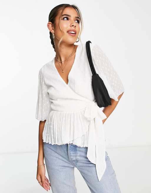 ASOS DESIGN dobby wrap short sleeve blouse with pleated peplum hem in ivory Very well made.