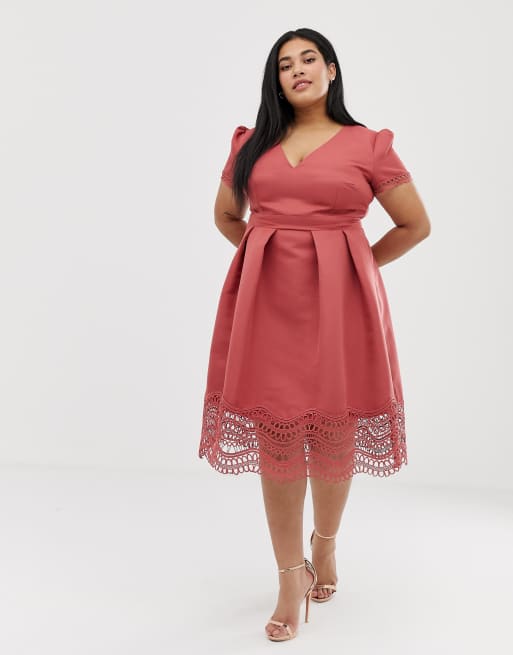 Little Mistress Plus plunge front full prom midi dress with lace hem in terracotta Very well made.