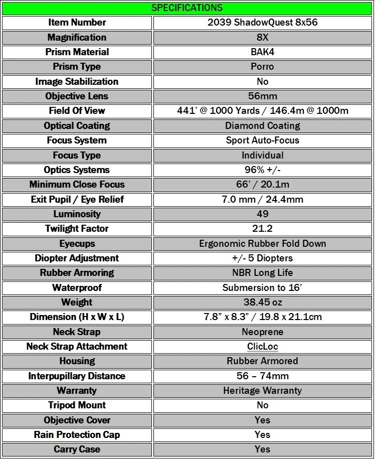 Steiner s ShadowQuest 8x56 Binoculars make use of large objective Very well made.