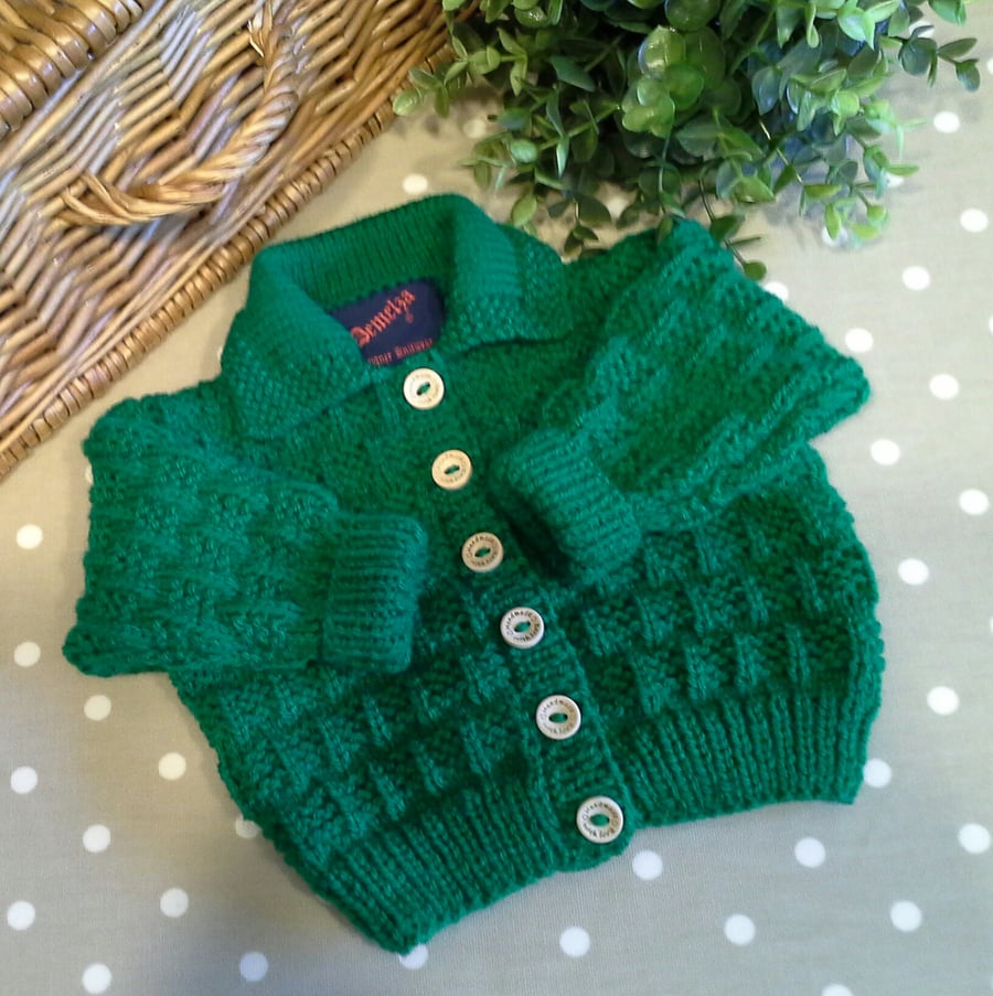 Green hand knit newborn baby sweater cute with bright colours on Very well made.