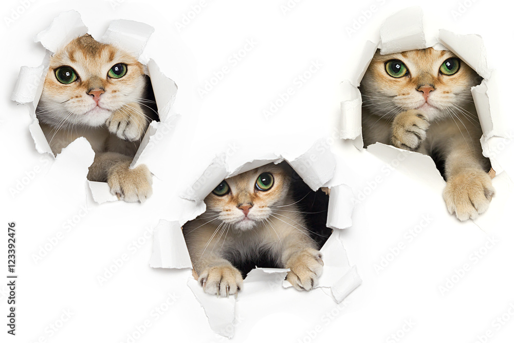 Set of one funny cat peeking out of torn paper isolated on white Very well made.