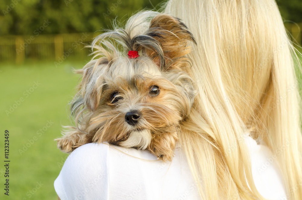 Closeup of cute Yorkshire terrier on shoulders of blonde woman Very well made.