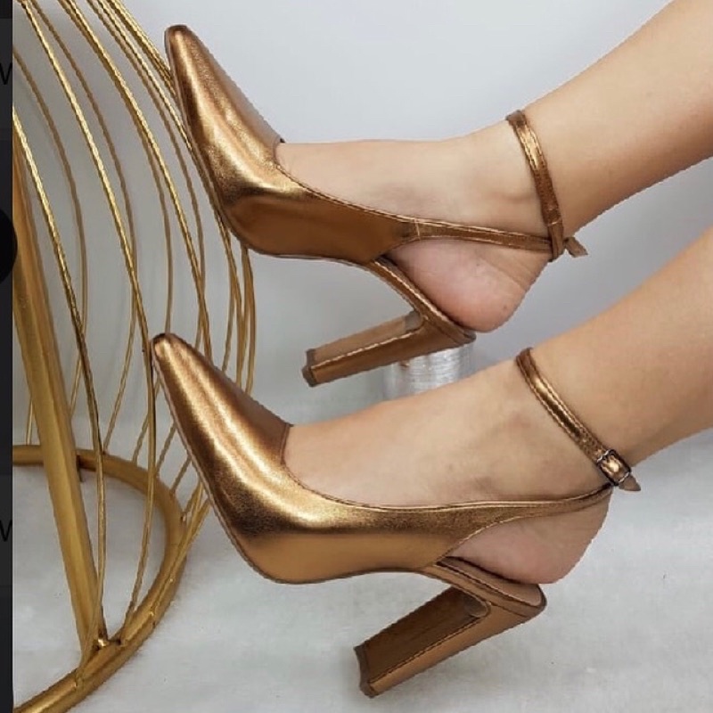 Scarpin Feminino Bico Fino Salto Grosso Metalizado Dourado Very well made.