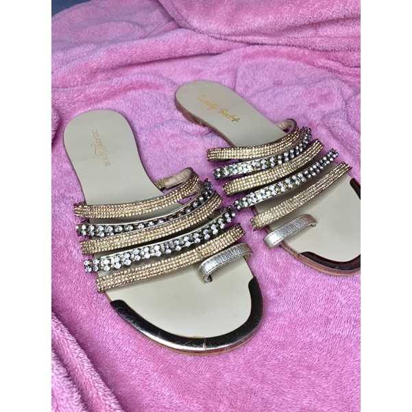Rasteira Dourada de Tiras com Pedraria e Strass Brilho Brilhosa Rasteirinha Desapego Brecho Bazar Very well made.
