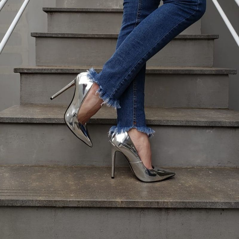 Sapato Prata Brilhoso Sola Nude Scarpin Verniz Tamanho 32 Bico Very well made.