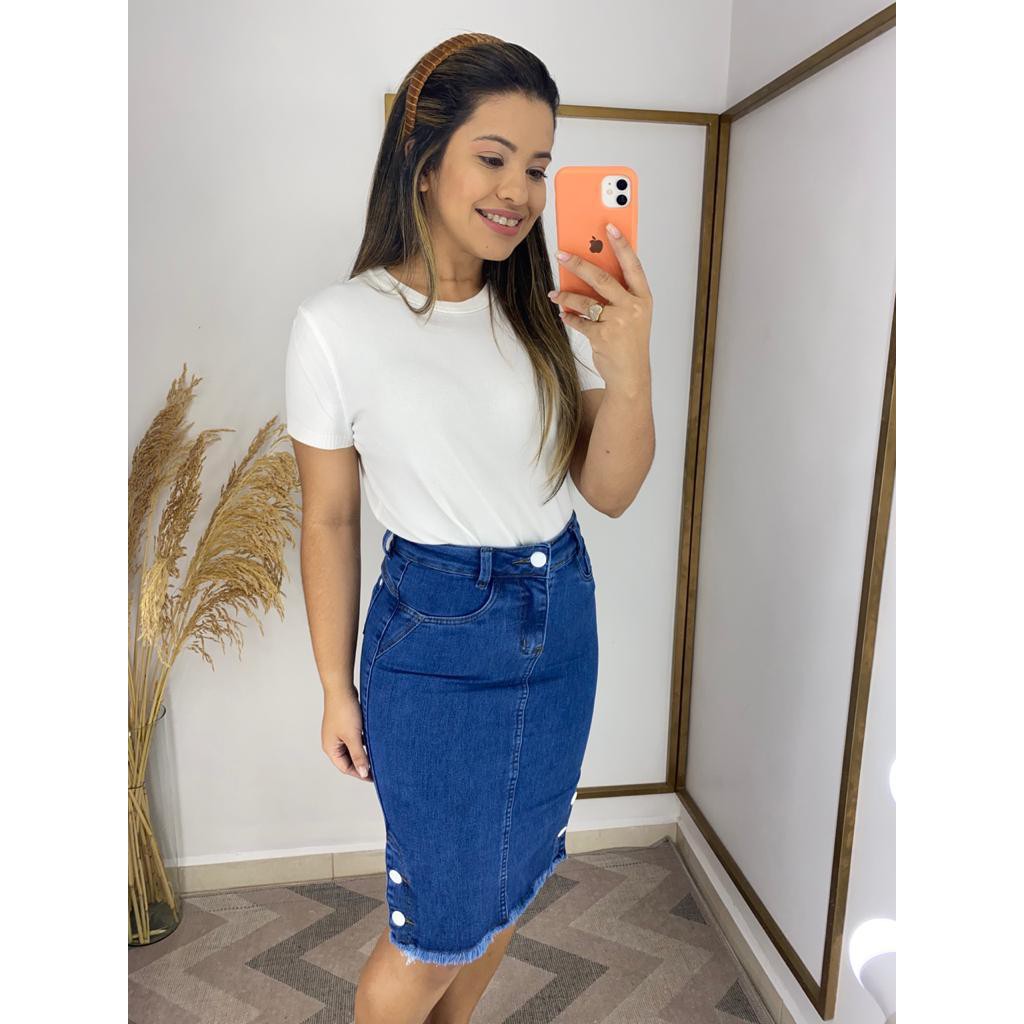 Saia Jeans Midi Cintura Alta Lycra Moda Evangelica Feminina Botoes Rodada Clara Escura Very well made.