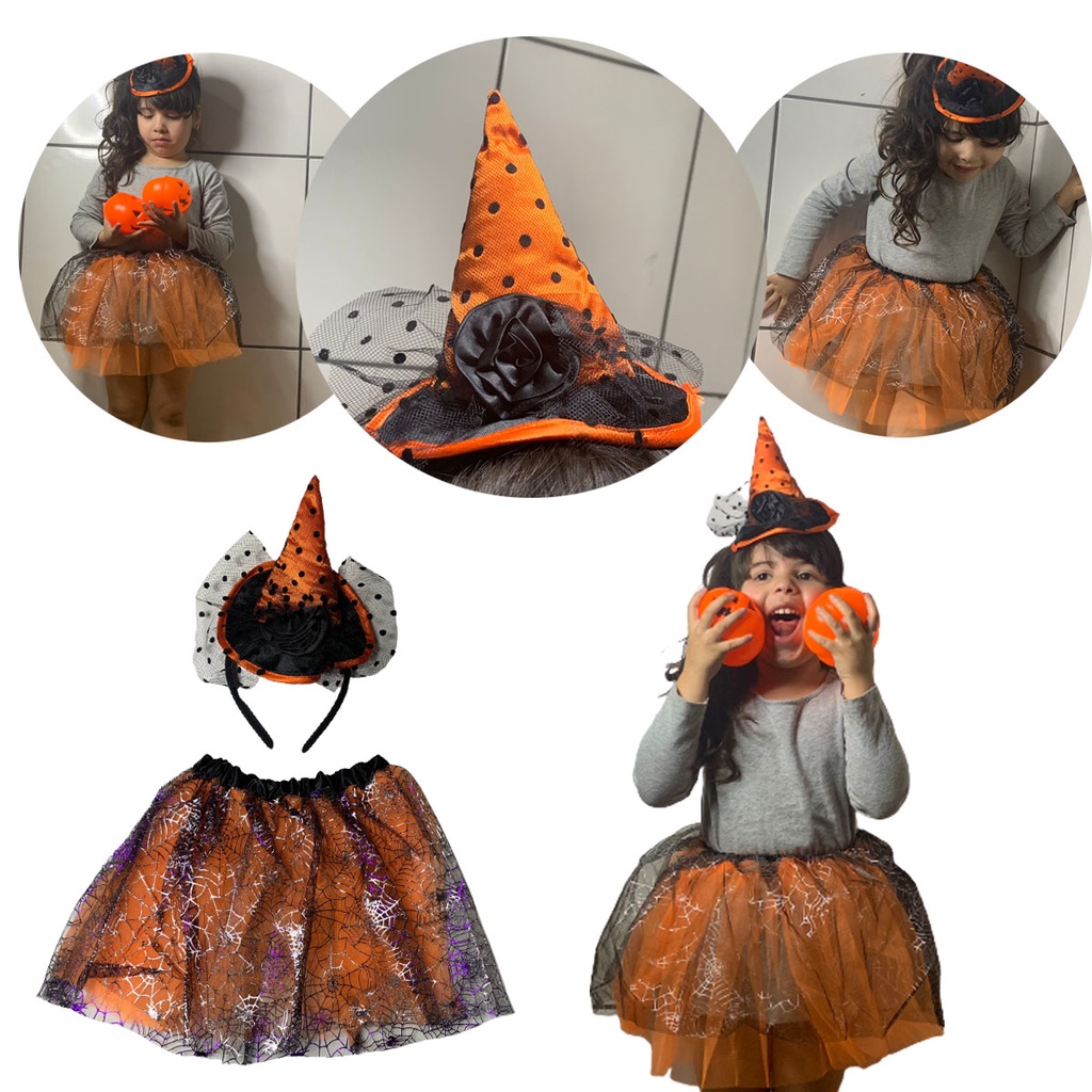 Fantasia Infantil Bruxa Bruxinha 2 p s Saia Tule Tiara Halloween Carnaval Laranja E Preto Very well made.